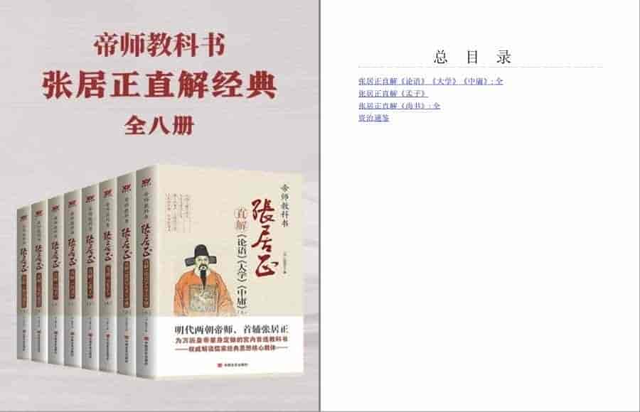 帝师教科书张居正直解经典合集,收录《张居正直解<论语><大学><中庸>全2册》《张居正直解<资治通鉴>全2册》《张居正直解<孟子>全2册》《张居正直解<尚书>全2册》。