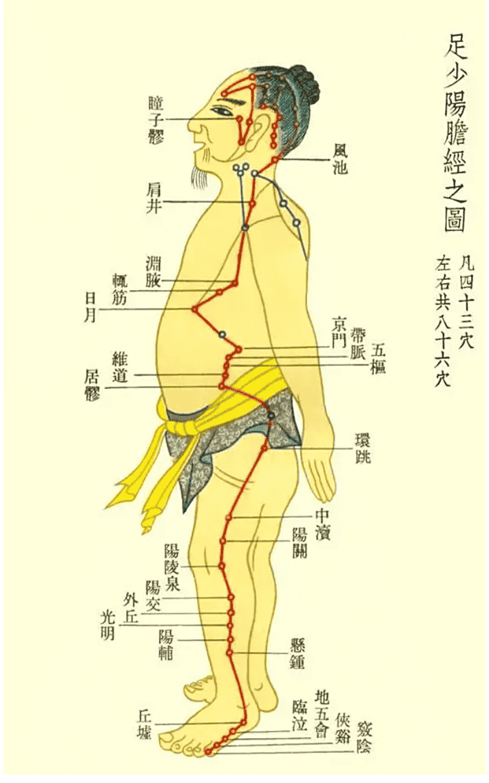 足少阳胆经是一条很长的经络,途经我们的小腿、大腿外侧,两侧胸胁,以及肩背部、后枕部、和头面部,从我们的脚趾一直循行到头上,由此可见足少阳胆经是我们人体中一条非常重要的经脉。