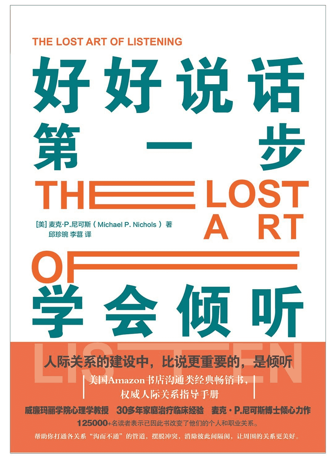 说与听,是沟通的两大要件;但大家都急着说,却少有人用心听。威廉玛丽学院的心理学教授麦克▪P.尼可斯博士深知“善听”对于建设各关系的重要性,三十多年的心理咨询和家庭治疗的临床丰富经验,他归纳出了成为一个更好的倾听者所需的各项技能:先搁置自己需求,抱持同理,化解情绪化反应,运用反应式倾听……在本书中,他结合令我们感同身受的真实的案例和系统的心理解析,附以简单实用的练习,旨在让你掌握如何利用真正倾听来改善自己的个人和职场关系。帮助你打通各关系“沟而不通”的管道,摆脱冲突,消除彼此间的隔阂,让周围的关系更美好。