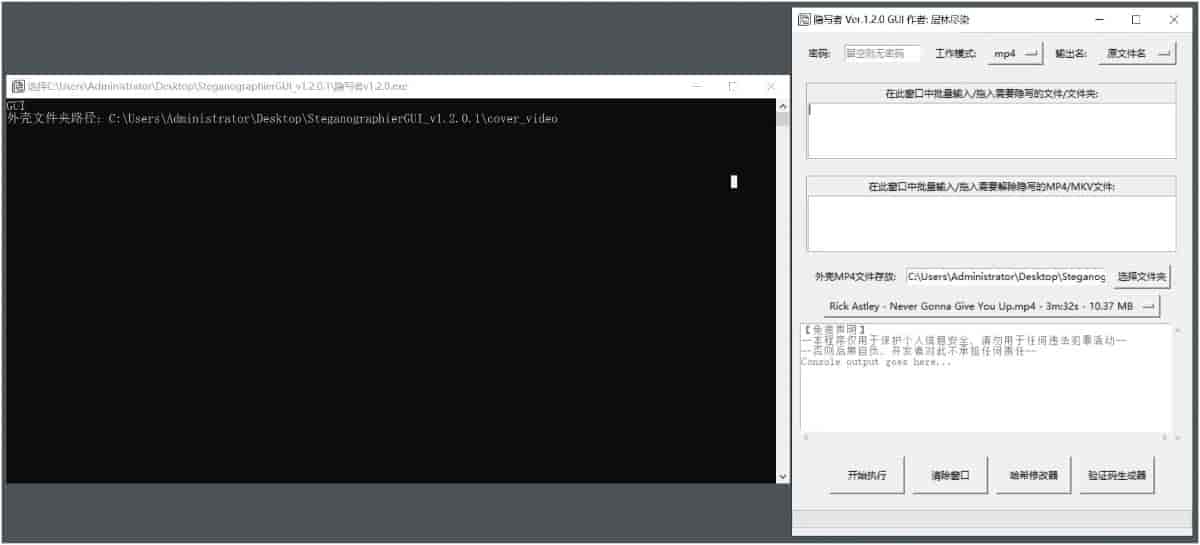 隐写者 可以将文件或文件夹隐写到视频文件中,或从视频文件中提取隐写的文件或文件夹。程序支持命令行界面 (CLI) 和图形用户界面 (GUI) 两种模式。除了隐藏文件外没还可以修改文件的HASH值和生成验证码。