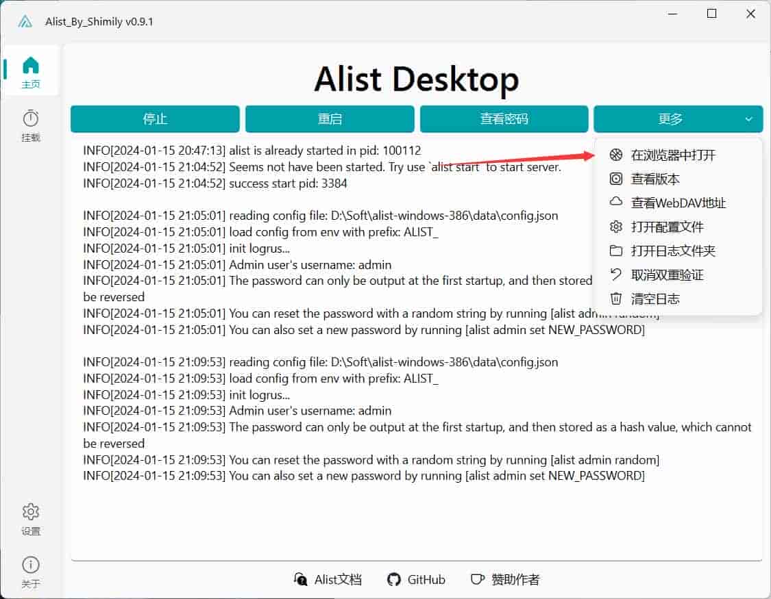 打开Alist Desktop桌面版,进入主页,点击右边更多,在浏览器中打开